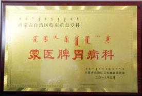 目前 ,我 院脾 胃病科是 自治 区蒙医 临床重 点专科; 脑病科 、疗术科是 自治 区蒙医特 色优势重点专科; 心血管科 、心身医学科是市级重点学科; 拥有梁高娃全国基层名蒙医 传承工作室1个;2 020年5月我 院名蒙医工作室被评为通辽市职工创新工作室。