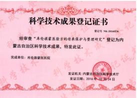 目前 ,我 院授权发 明专利1项 ,实用新型专利2项; 拥有 自治 区科学技术成果1项 ,正 在登记 的 自治 区科学技术成果1项 ,发行 “ 库伦旗 蒙 医验方集 ” 的专著1部 ,参编专著1 部 ,共发表学术论文140多篇 ,其 中,3篇 论文在 国家核心医学刊物上发表。